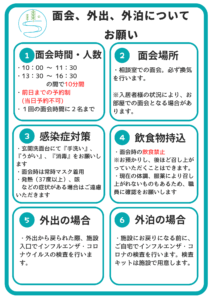 面会再開のお知らせ 2025.09.22 おはようございます。心の里さかたにです。 当施設では新型コロナウイルス感染症対策強化の為、ご家族様には対面での面会をご遠慮いただいておりましたが、2025年9月26日より下記内容で面会を再開させていただきます。面会中止の期間ご協力ありがとうございました。 面会は前日までの予約制となります。当日のご予約は出来かねますのでご了承ください。